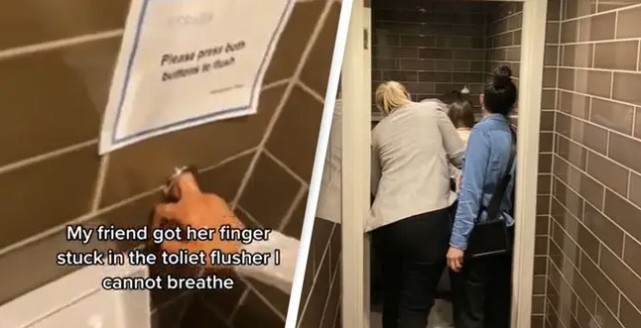 Kaya日前和朋友出门,但朋友一时尿急到公厕上厕所,看见厕所墙壁上贴着“冲水需同时按下两个按钮”,便不疑有他地照做了,可是按下按钮后手指头却莫名卡住。